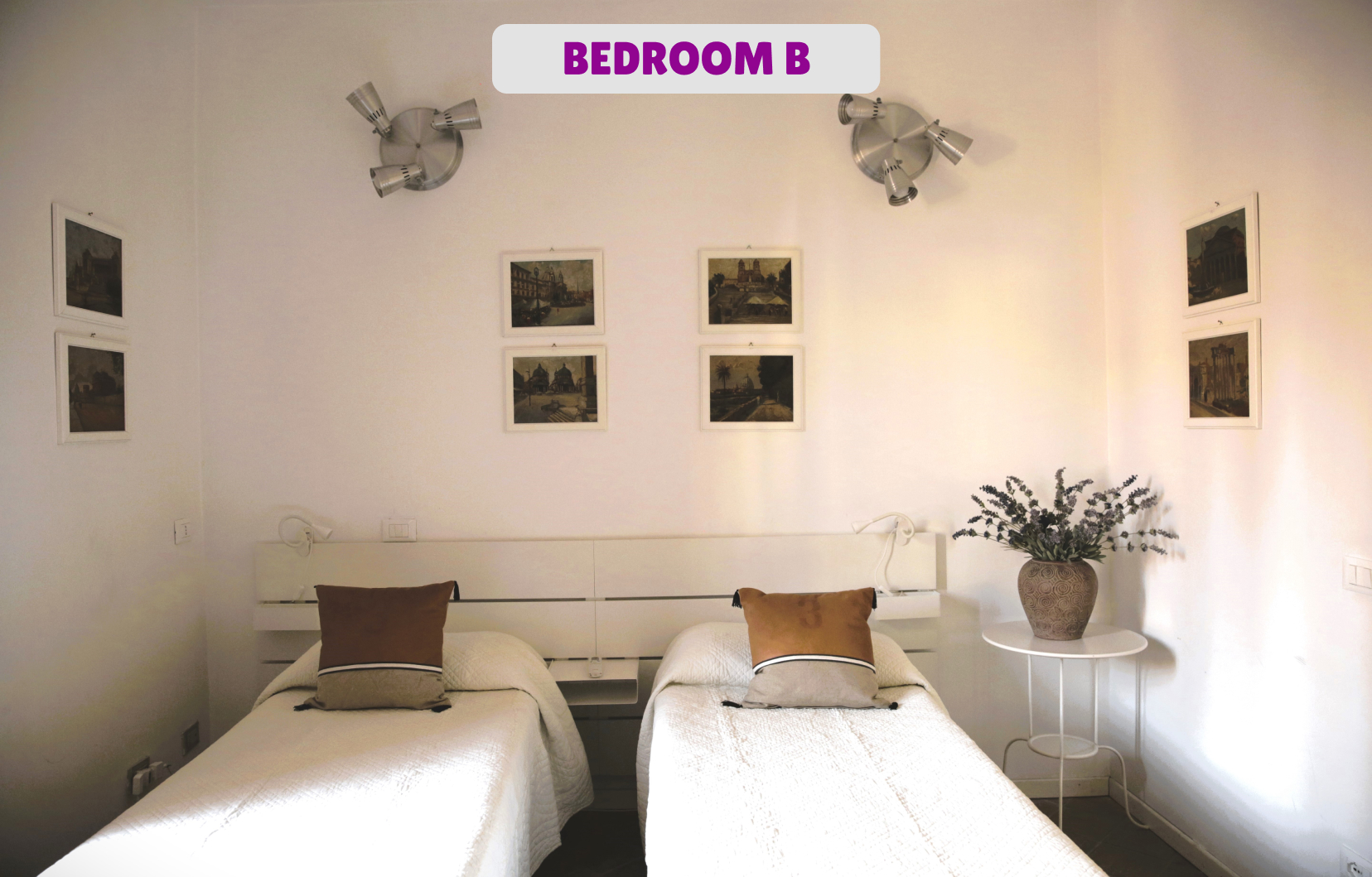 - Bedroom B – Sleeps 2: twin bedroom (or double upon request) facing a quiet courtyard. En-suite full bathroom with shower box.